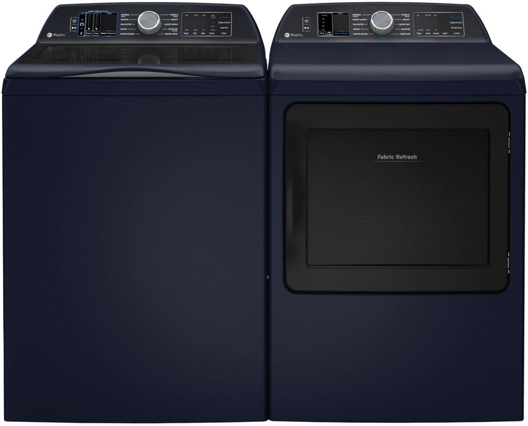 GE Profile™ Royal Sapphire Blue Laundry Pair with a 5.3 cu. ft. capacity top load washer and a 7.3 cu. ft. capacity front load electric dryer.Read More