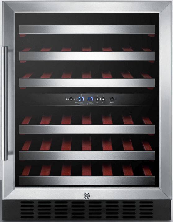 Store your finest collection in the SWC530BLBISTCSS, an undercounter wine cellar with advanced features and stunning design. Two digital thermostats allow you to chill your white wine while separately preserving red at a warmer temperature. Slide-out wooden shelves with stainless steel trim let you store up to 46 standard 750ml sized Bordeaux bottles. Alternatively, you can store up to 40 bottles of the wider Pinot Noir or Chardonnay bottles, while still fitting an additional six Bordeaux bottles. Full automatic defrost, interior lighting, and SUMMIT's own "hidden" evaporator help to keep use and maintenance simple. The SWC530BLBISTCSS features a stainless steel wrapped cabinet, with a stainless steel trimmed glass door. A professional stainless steel door handle completes the look. Fully front breathing with a flush back, this model can function as a freestanding or built-in unit in any home with a taste for modern luxury.