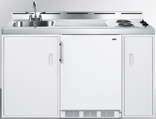 60 Inch Electric Combination Kitchen with 2 Burners, White Cabinet, and Stainless Steel Top: Fridge Not Included